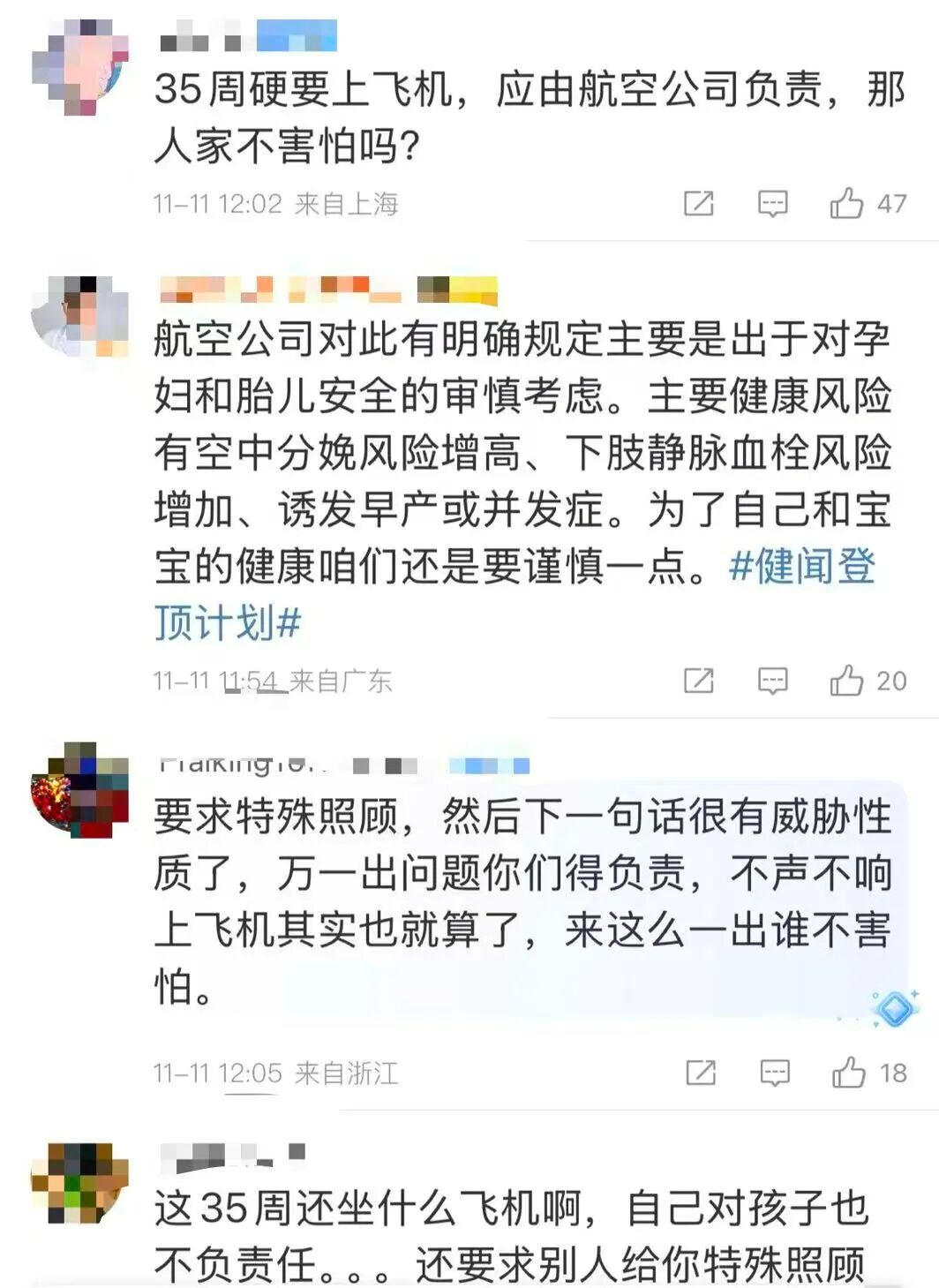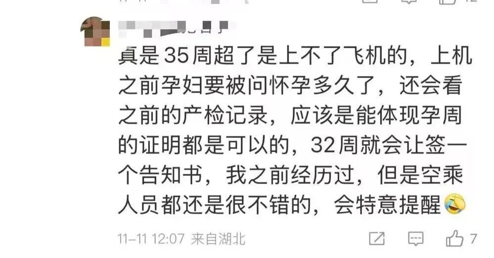 昨天(11月10日),有网友在社交平台发布视频称,一位孕妇登机后告知空乘人员自己怀孕超35周,要求被照顾,最终被劝下飞机。