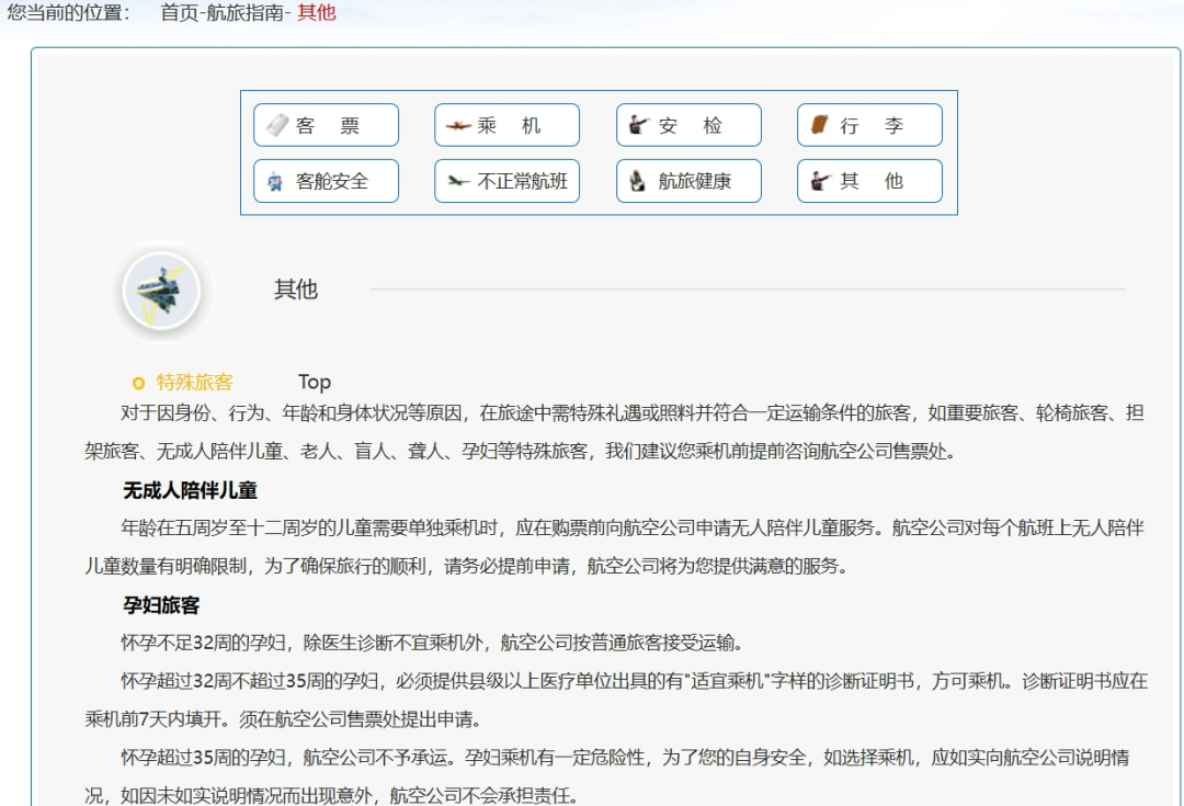 记者查询中国民用航空局的官方网站,在航旅指南中,也明确,“对于因身份、行为、年龄和身体状况等原因,在旅途中需特殊礼遇或照料并符合一定运输条件的旅客,如重要旅客、轮椅旅客、担架旅客、无成人陪伴儿童、老人、盲人、聋人、孕妇等特殊旅客,我们建议您乘机前提前咨询航空公司售票处。”