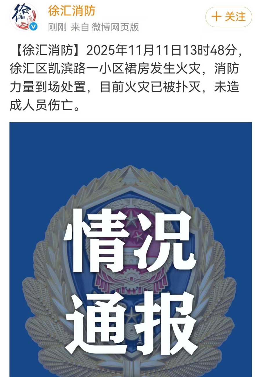 上海徐汇消防通报:2025年11月11日13时48分,徐汇区凯滨路一小区裙房发生火灾,消防力量到场处置,目前火灾已被扑灭,未造成人员伤亡。