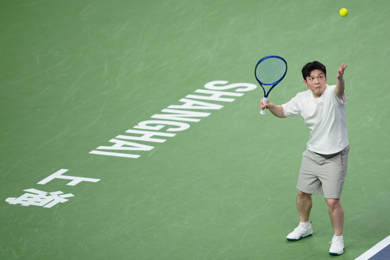 2024年10月11日,乒乓球运动员樊振东在网球双打表演赛中。 新华社记者 白雪飞 摄